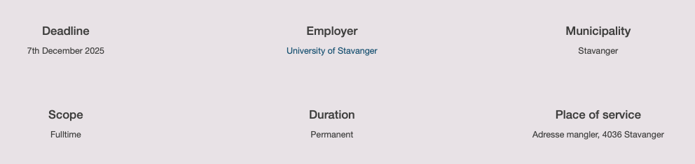 Information about the recruitment process can be obtained by contacting HR Advisor Christina Storm, phone: +47 518 317 53, email: christina.storm@uis.no.